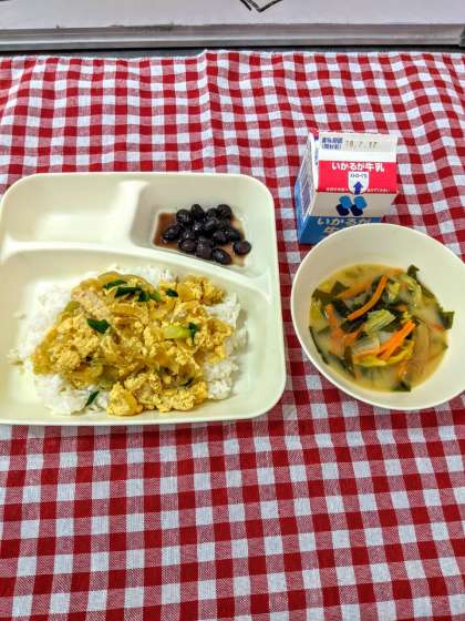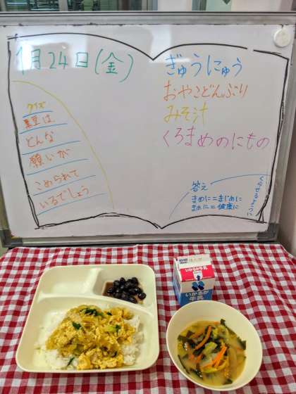 今日の給食は『親子丼』『みそ汁』『黒豆の煮もの』でした。