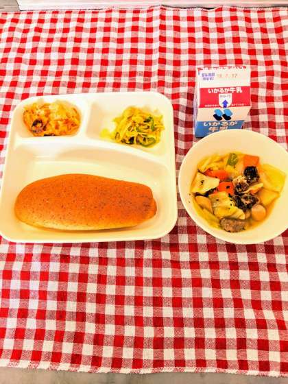 今日の給食は『ポトフ』『カレーソテー』『桃のクラフティ』でした。