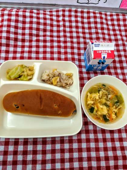 今日の給食は『中華おこわ』『卵スープ』『キャベツのオイスターソースいため』でした。