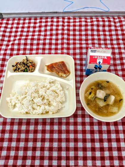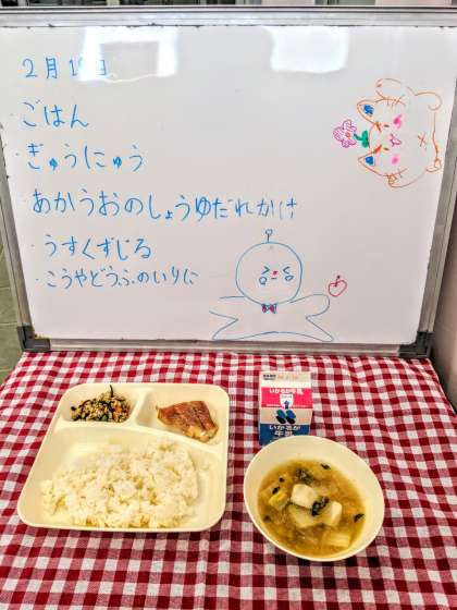 今日の給食は『あかうおのしょうゆだれかけ』『うすくず汁』『高野どうふのいり煮』でした。