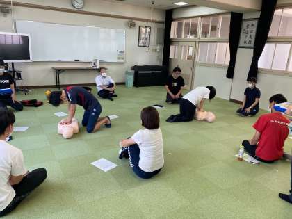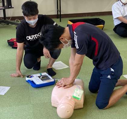 教員研修で救急救命講習を行いました。講習の中で人形と練習用AEDを用いて胸骨圧迫とAEDによる電気ショックの手順確認の体験をしました。胸骨圧迫の時の力の強さなど気をつけなければいけない点を再確認できて、よい研修になりました。