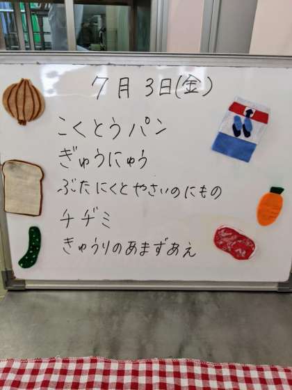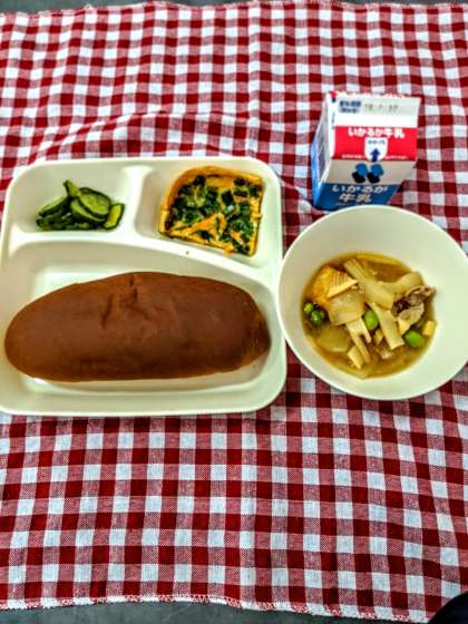 今日の給食は『豚肉と野菜の煮もの』『チヂミ』『きゅうりの甘酢あえ』でした。