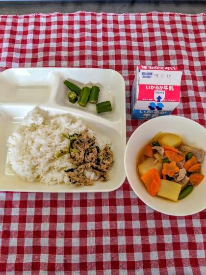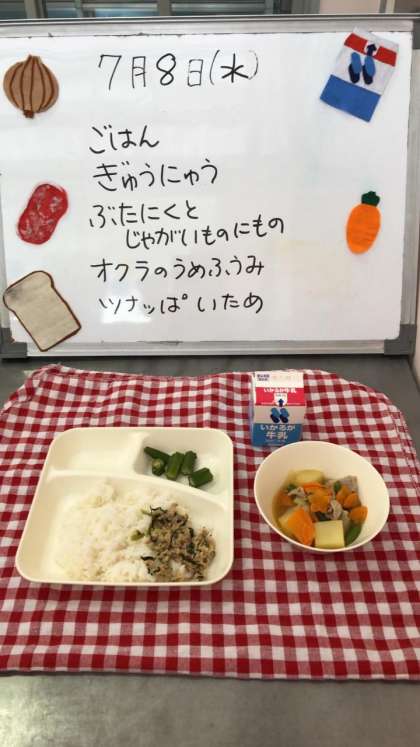 今日の給食は『豚肉とじゃがいもの煮もの』『オクラの梅風味』『ツナっ葉いため』でした。