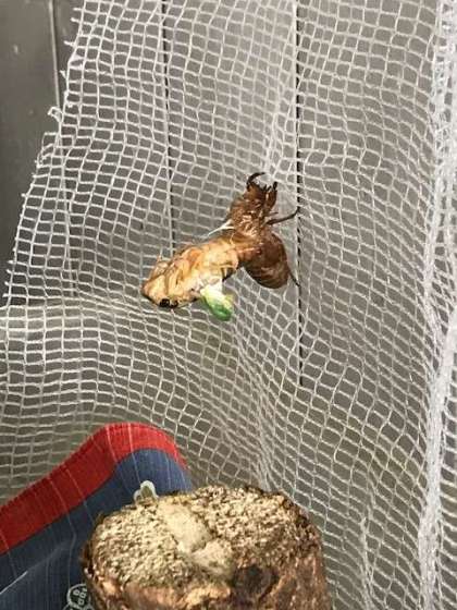 セミの幼虫を3年生の教室で羽化させるために、ネットを用意してはりつけました。