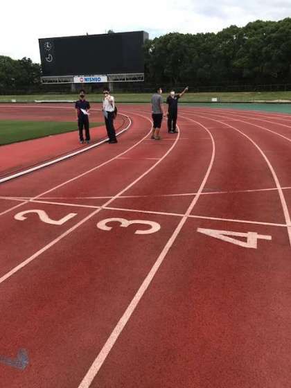 トラック内の芝生には入れないので、トラックの中だけで、いかにして運動会の演技や競技を実施するかを下見を通して考えました。