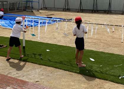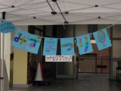 1年生が生活科で学習したことを活かして、みずまつりを開催しました。子どもたちは自分で作ったみずまつりで使う道具をより改良して望みました。道具を改良したことでみんなが楽しむことができ、「みずますたあ、だいせいこう。」と子どもたちは笑顔いっぱいでした。