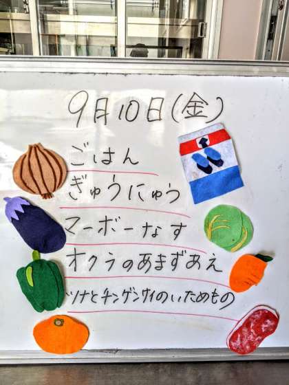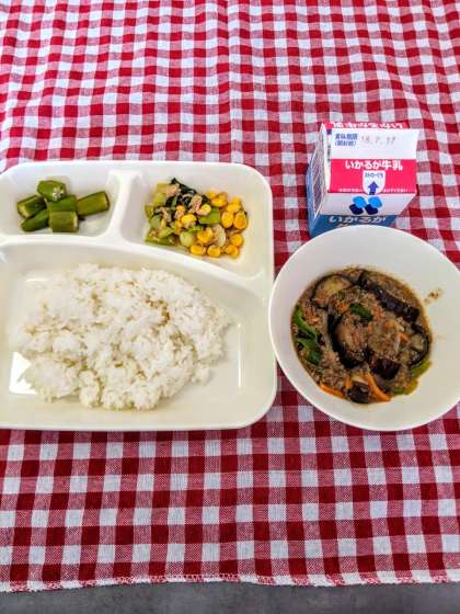 今日の給食は『マーボーなす』『オクラの甘酢あえ』『ツナとチンゲンサイのいためもの』でした。