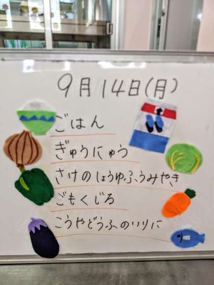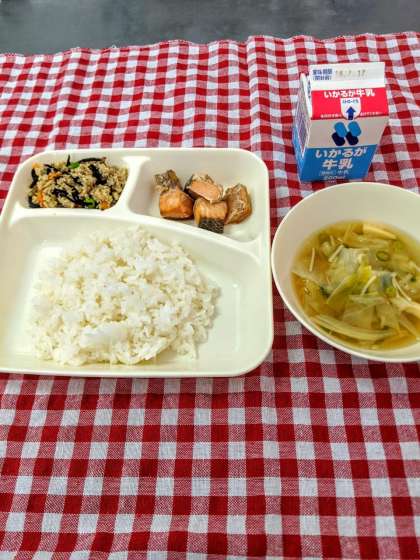 今日の給食は『さけのしょうゆ風味焼き』『五目汁』『高野どうふのいり煮』でした。