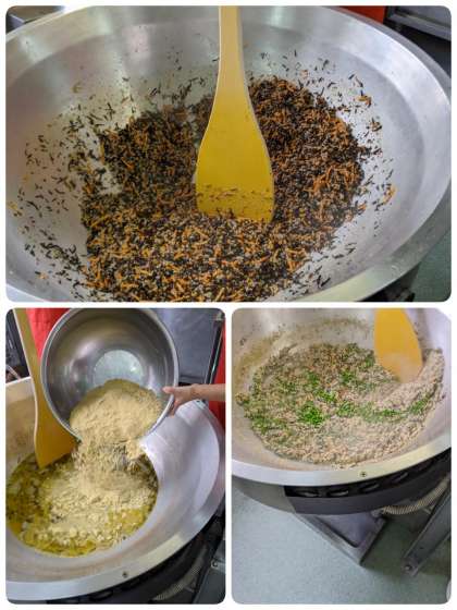 高野どうふのいり煮は、豚ひき肉、にんじん、ひじきをいため、だしで煮こみ、旨みがでたところにグリーンピース、粉末の高野どうふに味を含ませて仕上げた煮ものです。