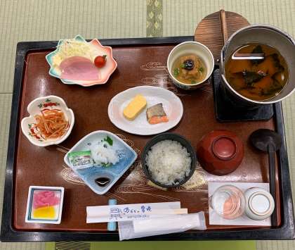 旅館の朝ごはんを美味しくいただきました。ごちそうさまでした。