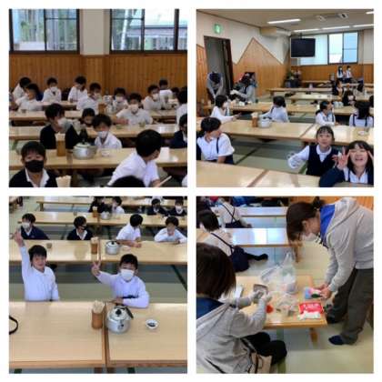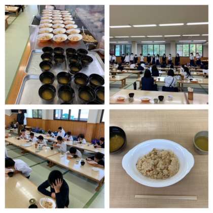 食堂でお昼ご飯をいただきます。メニューは、炊き込みご飯とかき玉汁、きゅうりの漬物です。食べやすくて、おかわりする子が多いです。