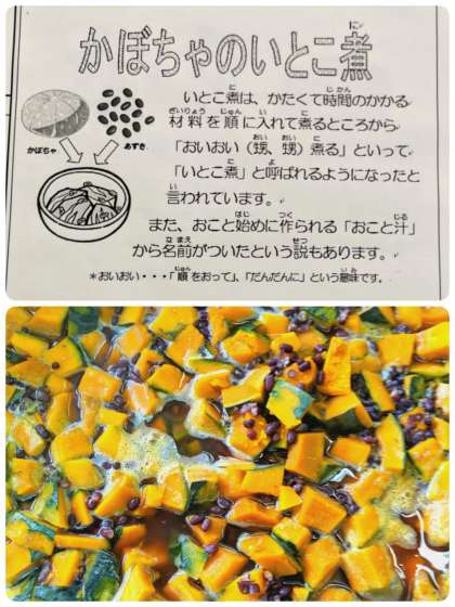 かぼちゃのいとこ煮は、だしで煮上げたかぼちゃを砂糖、みりん、うすくちしょうゆで味つけし、ドライパックのあずきを加えて煮ます。