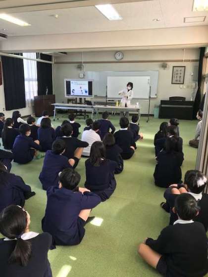 6年生の児童に、正しい薬の飲み方や、薬物乱用の危険性について、実験やスライドを交えながら教えてくださいました。