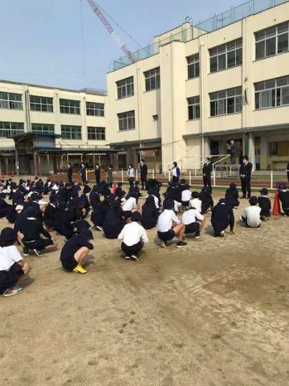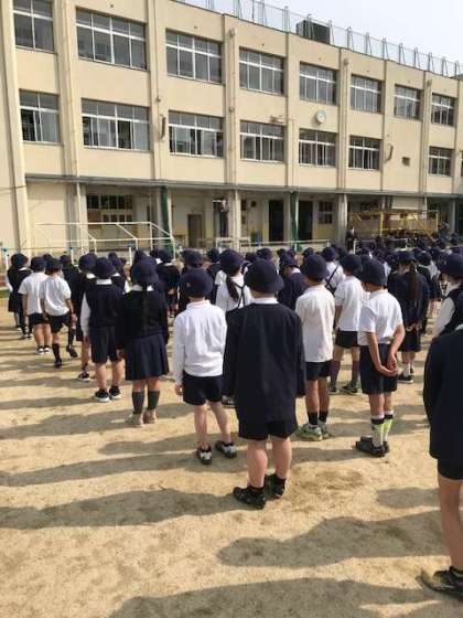 最初に、運動場に2〜6年生が集まって、今年来られた教職員を紹介する「着任式」がありました。