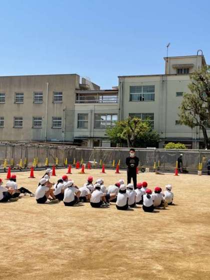 今日はたくさんの学年が運動場で体育の学習を行いました。とても気持ちのよい気候で子どもたちの元気な声が聞こえてきました。コロナ感染症予防のため、マスクをつけながらの学習ですが、子どもたちはのびのびと体を動かしていました。