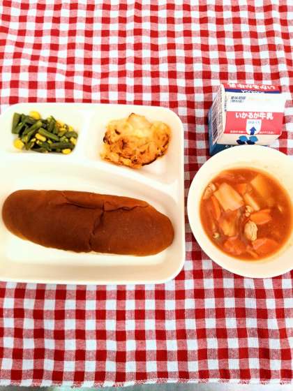 ケチャップ煮は、鶏肉を主材に、じゃがいも、にんじん、たまねぎ、青みにグリーンピースを使用し、ケチャップ、トマトピューレ、塩、こしょう、チキンブイヨン、ローレルで味つけしています。