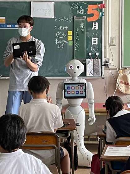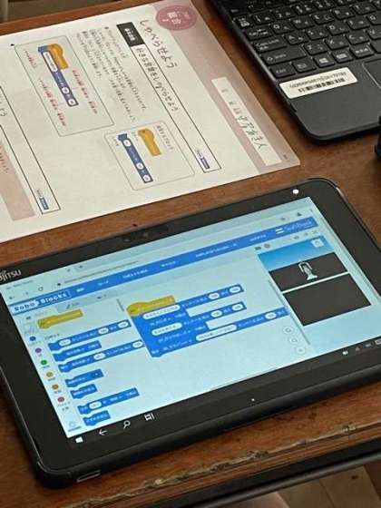 今日は4年生でプログラミング学習がありました。子どもたちはペッパー君に興味津々で、声を聞いて大喜びしていました。自分のプログラムでペッパー君が話したり、動いたりすることにも驚き、学習を楽しめたようでした。