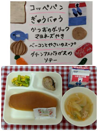 ベーコンと野菜のスープは、ベーコンをからいりすることで旨みを出し、じゃがいも、たまねぎ、にんじん、青みにグリーンピースを使用したスープです。