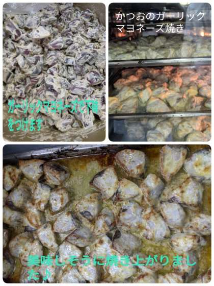 かつおのガーリックマヨネーズ焼きは、かつおに、にんにく、塩、白こしょう、マヨネーズで下味をつけ、焼き物機で焼きます。
