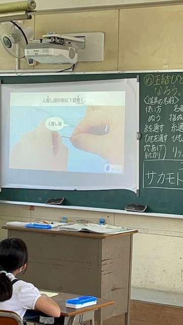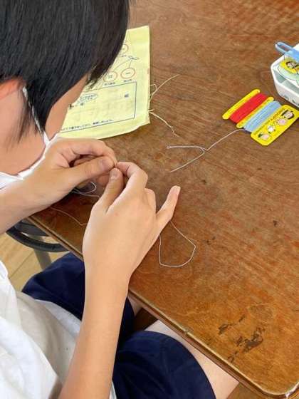 今日は5年生の家庭科の学習です。裁縫の学習で、まだまだ慣れない手つきで針に糸を通していました。玉止めについても動画をみて、玉のつくり方を学んでいました。玉の作り方をわかってもうまく玉ができず、たくさんの子が苦戦をしていました。