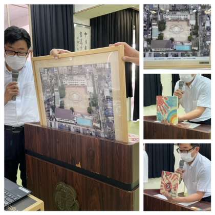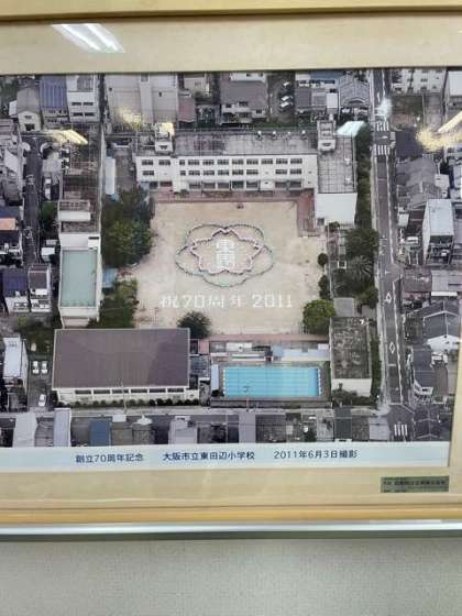 校長先生から創立80周年についての話がありました。今年は航空写真をとること、土曜授業で陶板つくり体験をすることなどの話がありました。下の写真は創立70周年の時の航空写真、陶板の見本です。