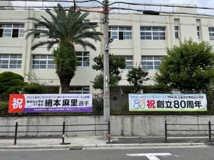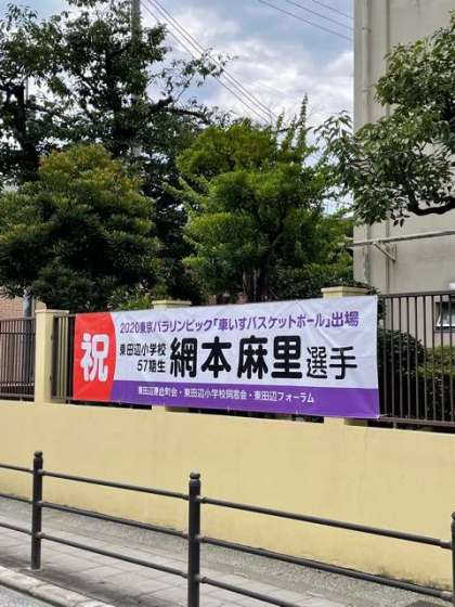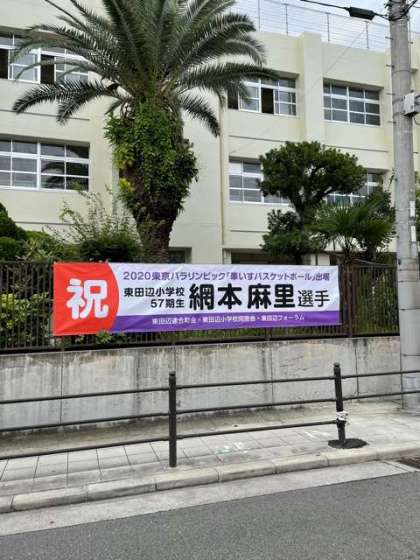 7月1日に校内で車椅子バスケットボール網本麻里選手との交流会をおこないました。今日は、その網本選手を応援するための横断幕を学校のフェンスに取り付けていただきました。地域の方で作っていただいた横断幕を見て、子どもたちも網本選手を応援する気持ちをさらにもってくれることと思います。