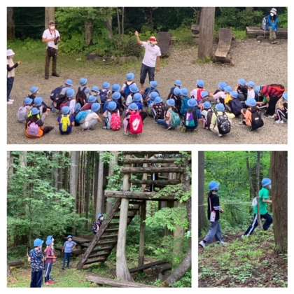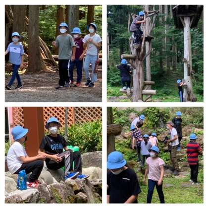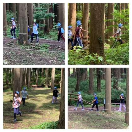 部屋割りと避難訓練の後、1時から食材探しゲームをしました。宿舎裏の林のアスレチックで、6つの食材名を書いたカードを探します。