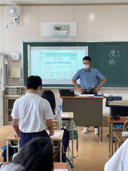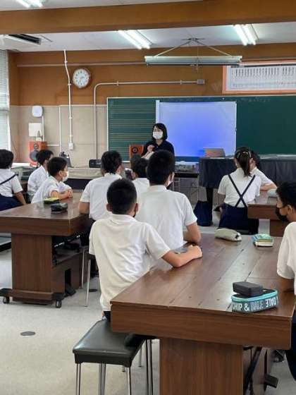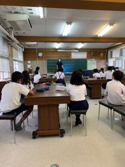 今日は中野中学校の先生方に来ていただき、6年生の教室で授業をしていただきました。学習内容は社会と音楽の学習でした。先生からは授業だけでなく、中学校の様子も聞かせてもらいました。子どもたちも中学校の話に興味を持ち、楽しい時間を過ごしていました。
