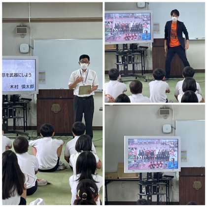 今日は6年生の学習でトップアスリートによる夢授業がありました。講師として木村慎太郎さんに来ていただきました。木村さんからは、選手としての思いを話していただいたり、足の使い方など走るポイントを教えていただいたりしました。普段とは違う学習の内容に子どもたちも楽しそうに取り組んでいました。