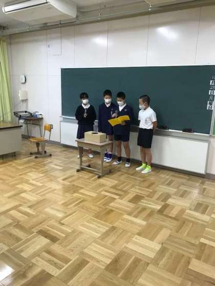 集会委員の児童がひくクジをどきどきしながら見守っていました。