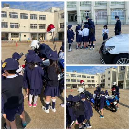 今日は1年生で防犯教室を行い、東住吉警察から警察官の方がたくさん来られました。自分の身を守るいろいろなルールを教えて頂いたり、パトカーやバイクにも乗せて頂いたりしました。また、報道機関も撮影に来られ、インタビューも行われました。子どもたちは真剣に話を聞いたり、間近に見るパトカーなどに目を輝かせて乗せてもらったりしていました。