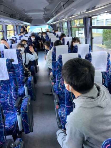 11月30日午前8時、見送りに来ていただいた皆さんに挨拶をして、6年生が修学旅行に出発しました。バスで信楽、鳥羽方面に行きます。