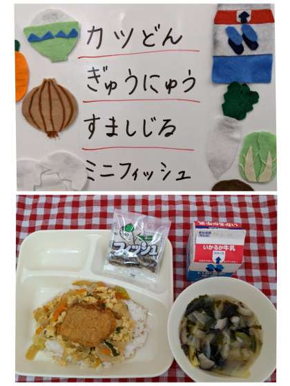 カツ丼を楽しみにしていたらしく、見本を見る前から「楽しみー」「おいしそう」という声が聞こえてきました。
