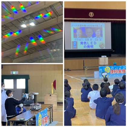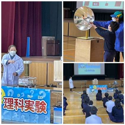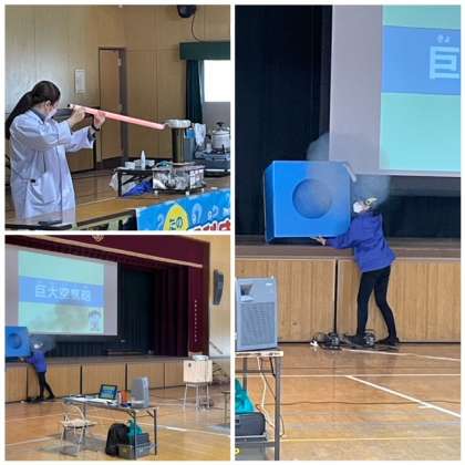 今回は4、5、6年生を対象に電気や光などいろいろな実験をしてもらいました。電気について、詳しい説明があったり、子どもたちが参加したりする実験もありました。最後はやはり空気砲!これがどの学年も1番盛り上がっていました。