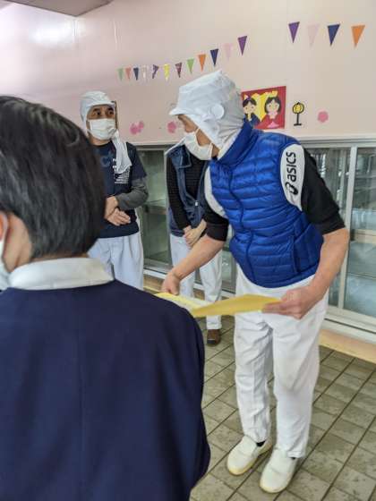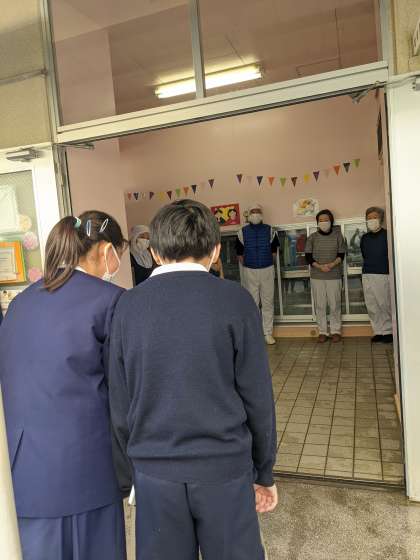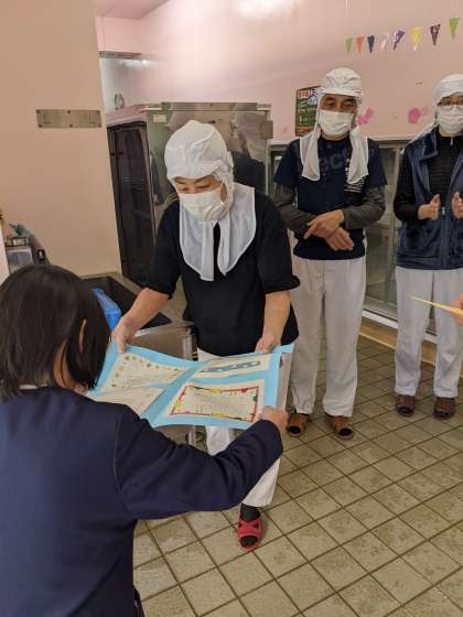 給食委員会の子どもたちが代表で、日頃の感謝の気持ちを込め、調理員さんへお手紙を渡しに行きました。