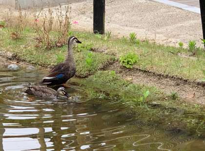 新しくできた池に、今朝カルガモがいました。見た目からつがいのようです。ビオトープに生き物が集まるのはうれしいことです。ただし、残念ながらそれまで池にいたフナやキンギョが見当たりません。もしかすると、カルガモに食べられてしまったのカモしれませんね。