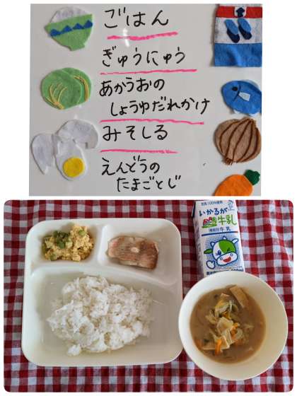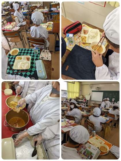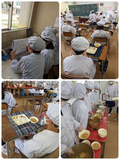 旬のさやつきのえんどうを給食室でひとつずつむいて調理しています。