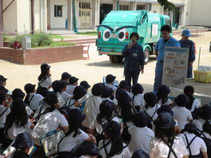 環境事業局の方に来ていただき、4年生がごみについて学習をしました。パッカー車について説明を聞き、ごみ収集の時のことについてのお話をききました。