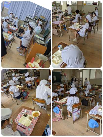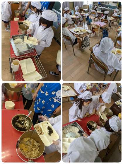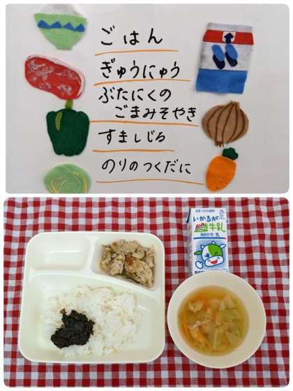 豚肉のごまみそ焼きは、豚肉にねりごま、砂糖、こいくちしょうゆ、赤みそを使った調味液で下味をつけ、たまねぎ、ピーマンを混ぜ合わせ、いりごまをふってから焼き物機で焼いています。