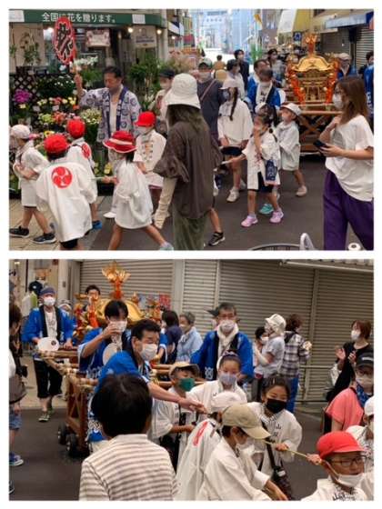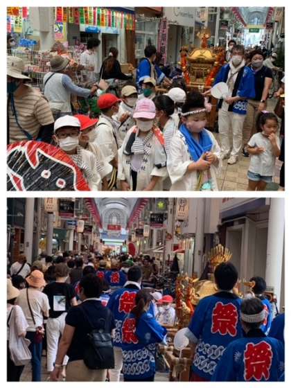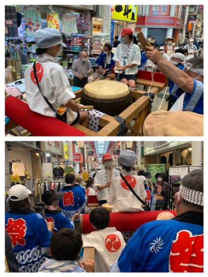 はっぴを着た子ども達がみこしを引いたり、タイコを叩いたりして、商店街を練り歩いていました。