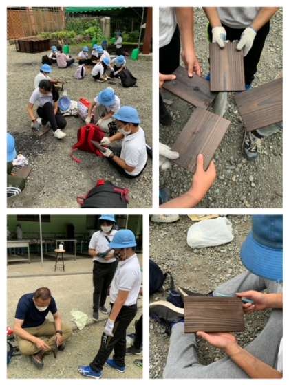 まず、スタッフの方に作る工程を教わりました。ススで真っ黒な杉の焼き板を歯ブラシや布で磨き、今日はここまで。後日、磨いた焼き板に絵付けをします。