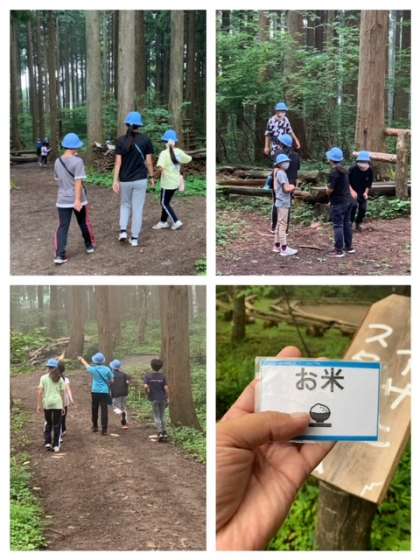 宿舎裏の林の中に、食材の名前を書いた6種のカードが置いています。班のメンバーで協力して、1枚ずつ集めます。