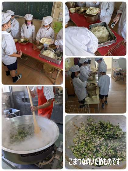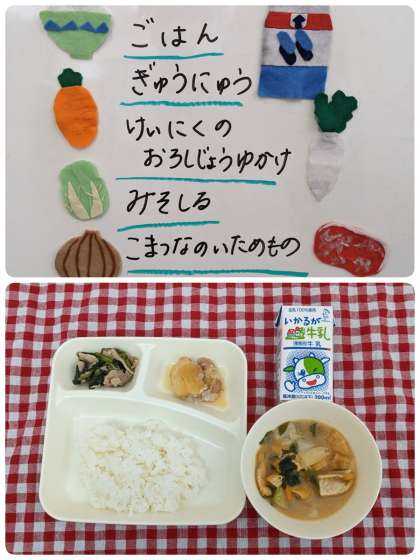 こまつなのいためものは、旬のこまつな、豚肉を炒め、砂糖、うすくちしょうゆ、こいくちしょうゆでシンプルに味つけしています。