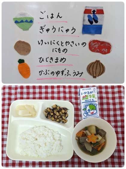 ひじき豆は、乾燥大豆を熱湯につけて戻し、でんぷんをまぶして油で揚げ、ひじきが入った調味液をからませます。子どもたちにも大人気の一品で、鉄や食物繊維が多く含まれている栄養満点な献立です。