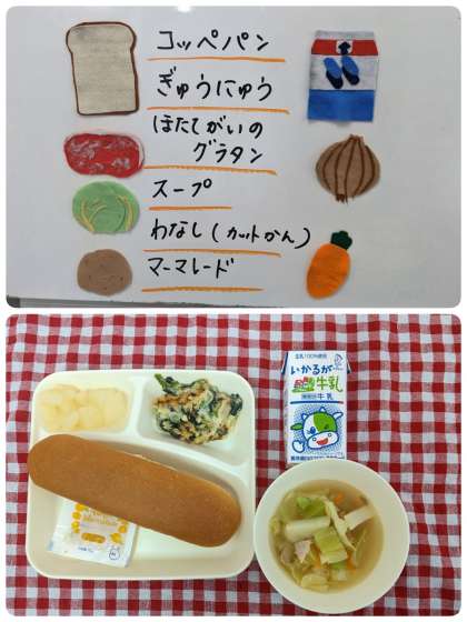 ほたて貝のグラタンは、ほたて貝を主材に、たまねぎ、冷凍のほうれんそうを使ったホワイトソースのグラタンです。グラタンは毎回子どもたちに人気の献立で、おかわりの子どもたちがいっぱいいました。