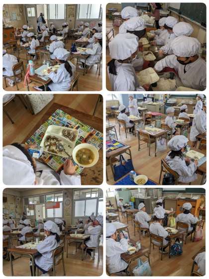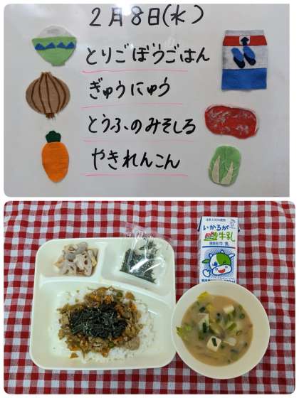 鶏ごぼうご飯は、しょうが汁で下味をつけた鶏ひき肉を主材に、つきこんにゃく、ごぼう、にんじん、グリーンピースを使用しています。子どもたちに大変好評な混ぜご飯です。刻みのりをかけていただきます。