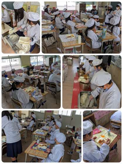 ハヤシライスは、子どもたちに大人気の献立のひとつです。牛肉を主材に、小麦粉とサラダ油を褐色になるまでじっくりいためて作る手作りのブラウンルウ、デミグラスソースなどで煮込み仕上げます。見本のラッキーにんじんを見て、「ラッキーにんじん入ってるの!」と興奮気味の子どもたちでした。