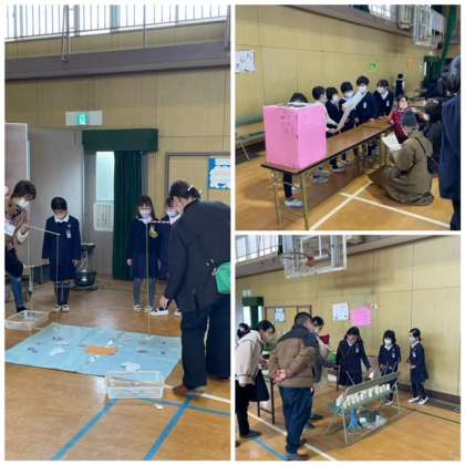 3年は理科で学習した磁石の性質を利用して「磁石の王国」を開きました。たくさんのコーナーに子どもたちのアイディアが詰まった多くのおもちゃなどがありました。