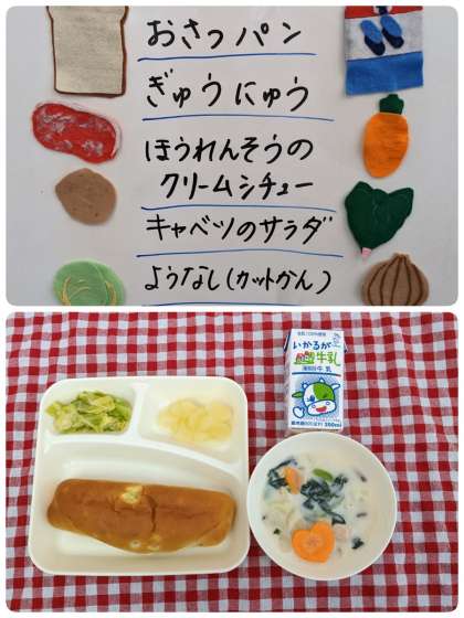 ほうれんそうのクリームシチューは、子どもたちに毎回人気の献立です。小麦粉と綿実油で作る手づくりのホワイトルウでとろみをつけ、生クリームでコクを出しています。