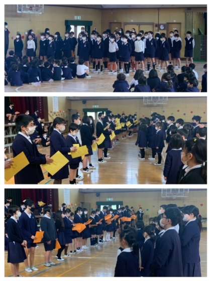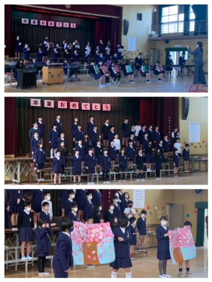 全校児童が集まって、2・3時間目に卒業を祝う会を行いました。各学年からのお祝いの言葉や合唱の後、6年生が合奏と合唱を披露しました。これまでお世話になった6年生に、心を込めたお祝いのメッセージを届いたと思います。
